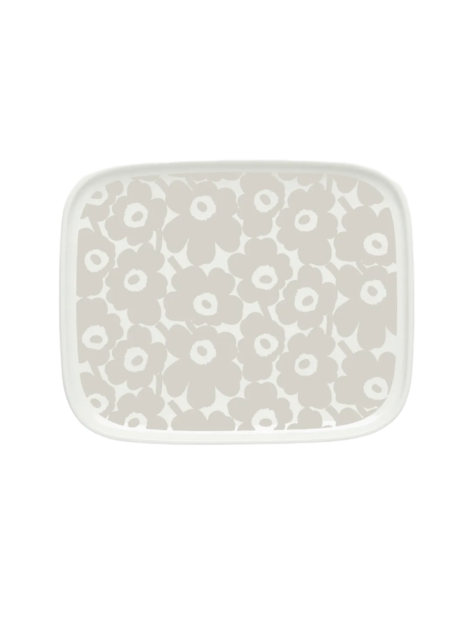The small rectangular Oiva plate is made of dishwasher, oven, microwave and freezer safe white stoneware. The plate features the Pikkuinen Unikko pattern.