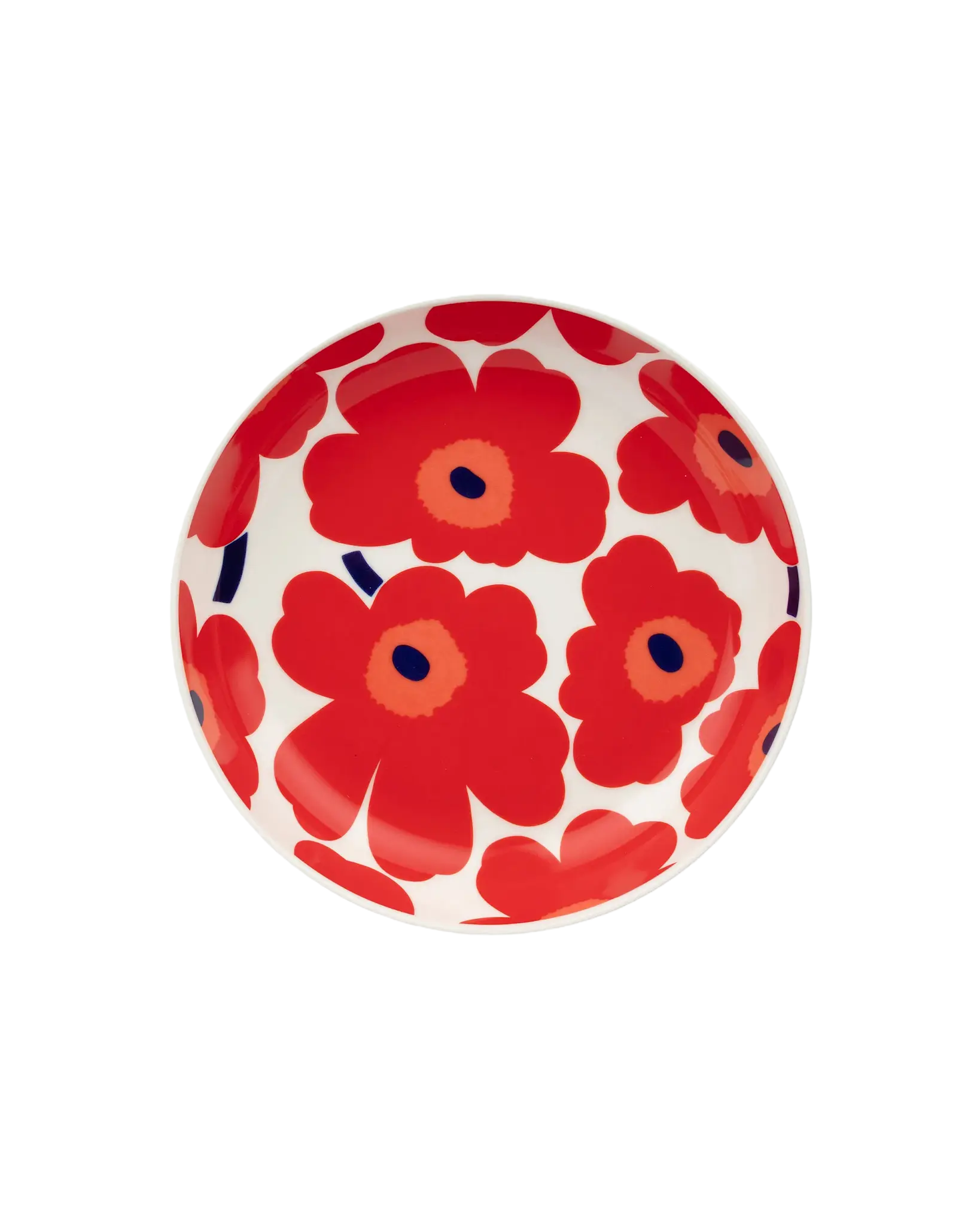 The Oiva deep plate with Unikko pattern is made of dishwasher, oven, microwave and freezer safe whiteware.