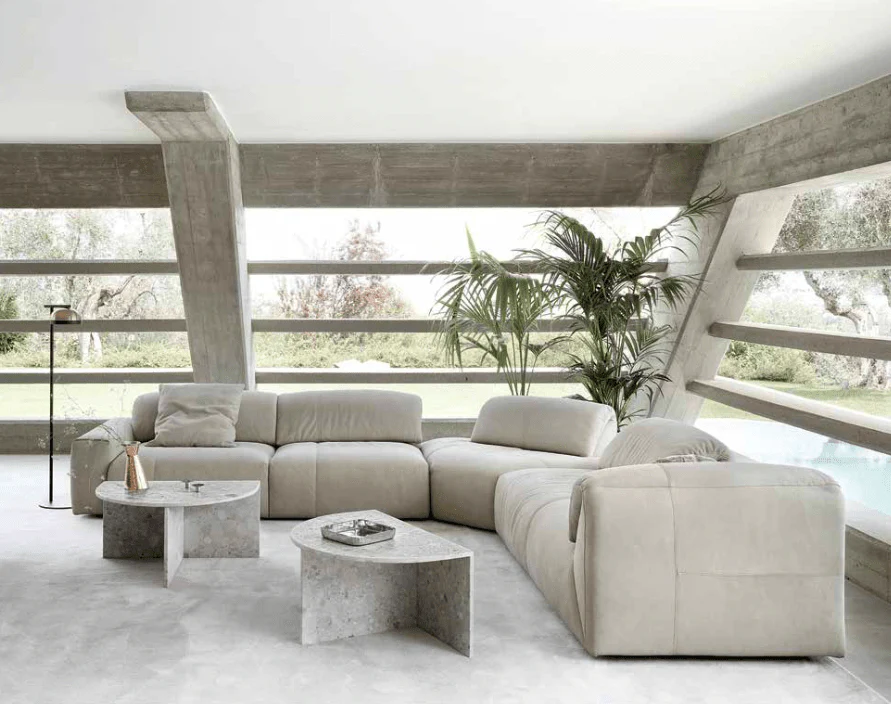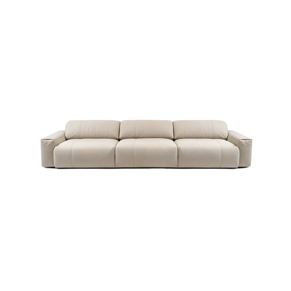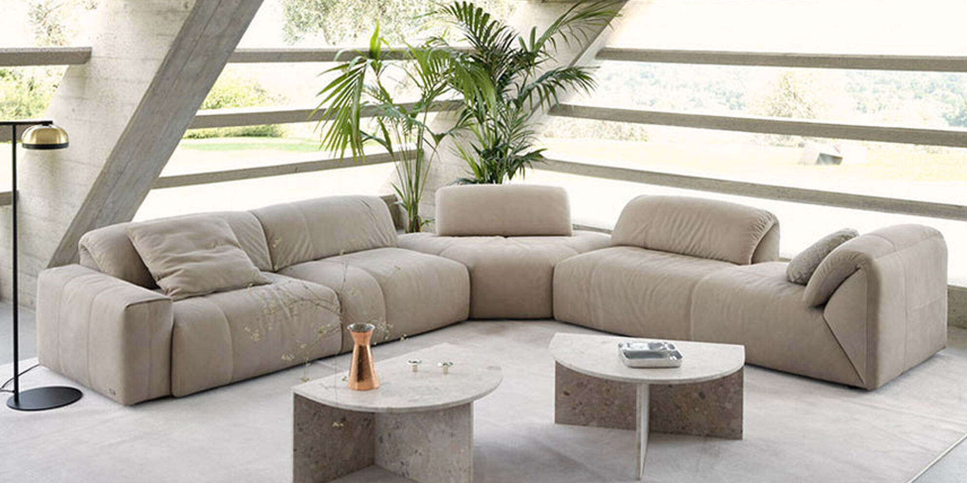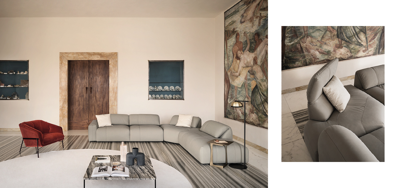 A sofa with soft and embracing shapes, where the manual movable back and the rich padding on the seat, enhance the comfort, giving multiple interpretations.