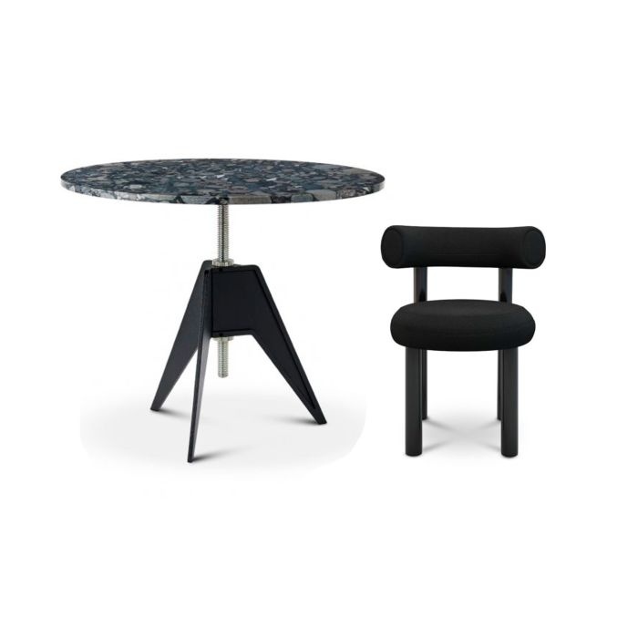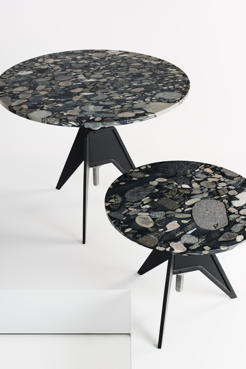 Screw Cafe Table is a simple, honest design, inspired by materials and processes of the industrial revolution. Its rotating top on a threaded steel pole allows for adjustable height, while being sturdy, durable, elegant and ideally suited for use both inside and outside. The 900mm round stone top made of colourful marble mined from the Shandong and Fujian provinces of China. The pattern of the natural marble is due to the crustal movement changes in the process of lava extrusion, developed over millions of years.