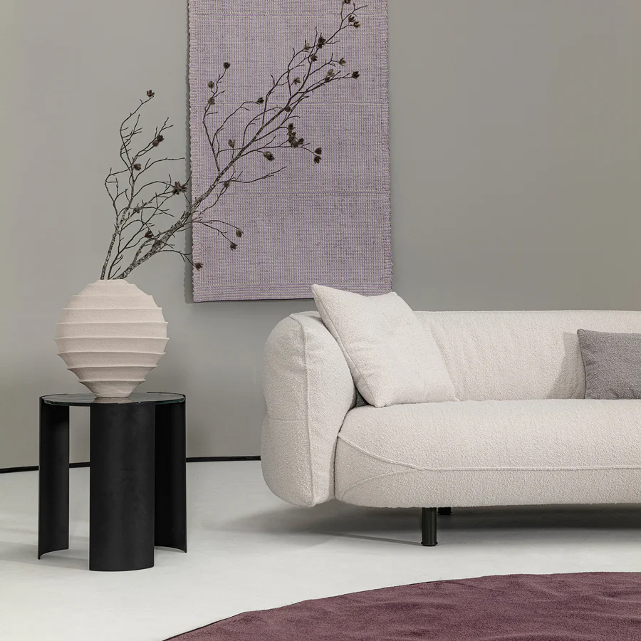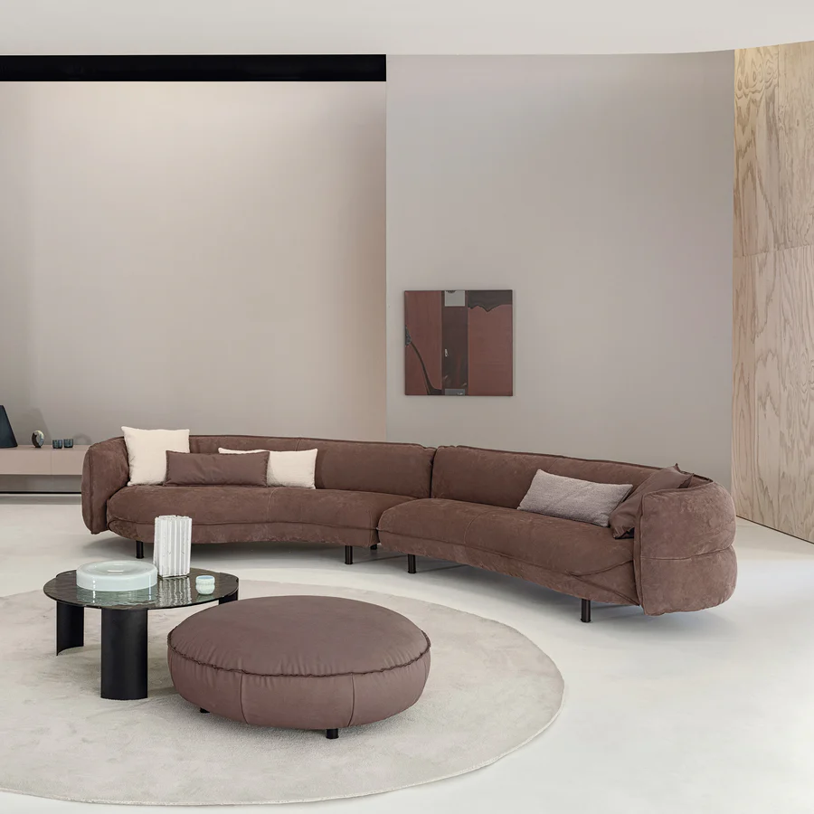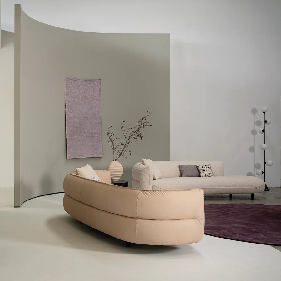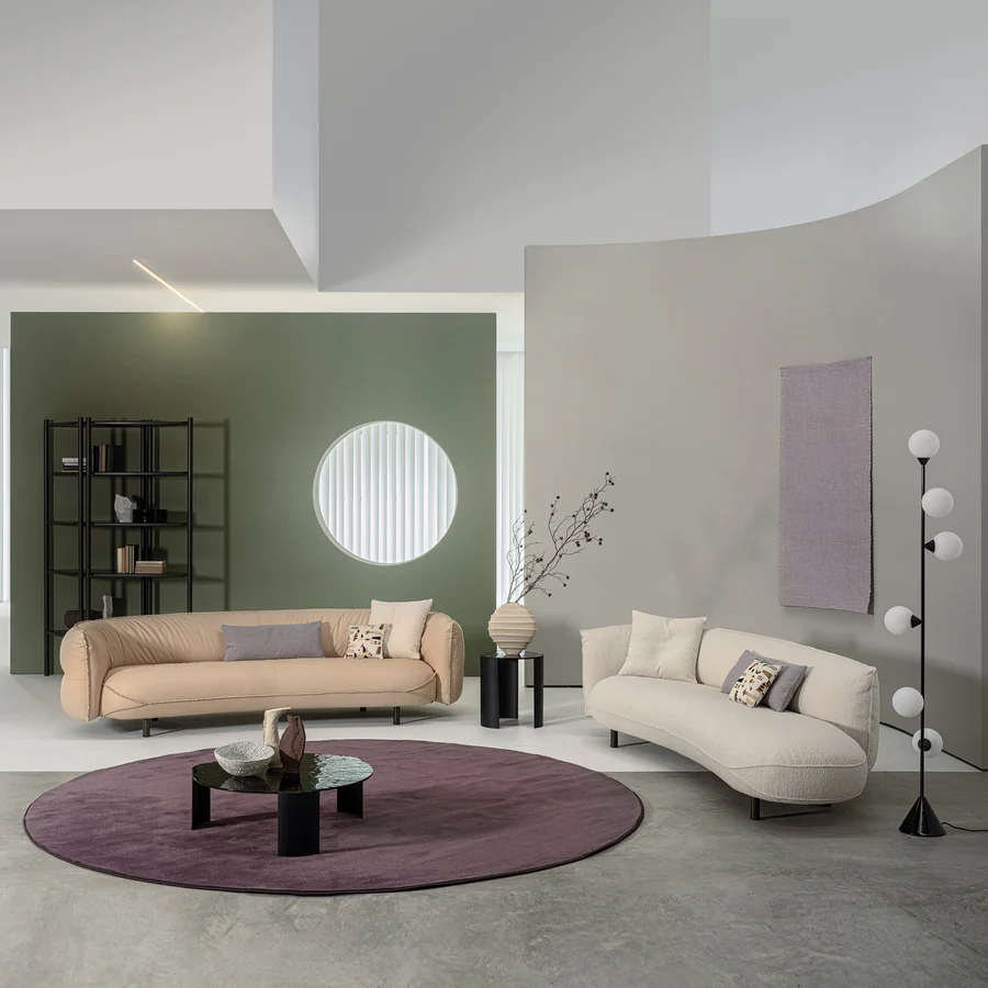 Modular sofa with thick soft seating and an appealing curved back, constructed with wooden frame supported by elastic belts. Seat cushion and backrest padded with expanded polyurethane foam, covered with an acrylic fiber layer. Metal legs matt painted in 10 different RAL colors.