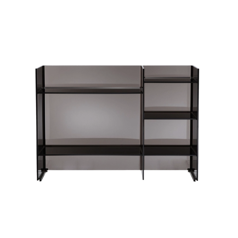 Multi-shaped and multi-purpose shelving system, stackable and modular, offering the possibility of creating a variety of geometric and chromatic compositions. This accessory can play the dual role as both container and room divider.