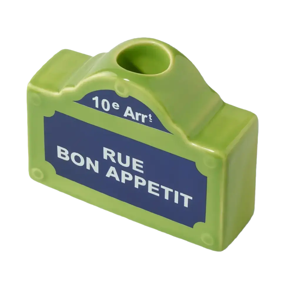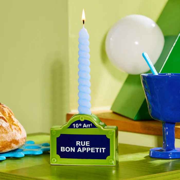 The Fluid Market Street Sign candle holder captures all the charm of Paris with its green, blue, and white glazed ceramic. A chic and bright decorative touch that brings elegance and whimsy to your home.