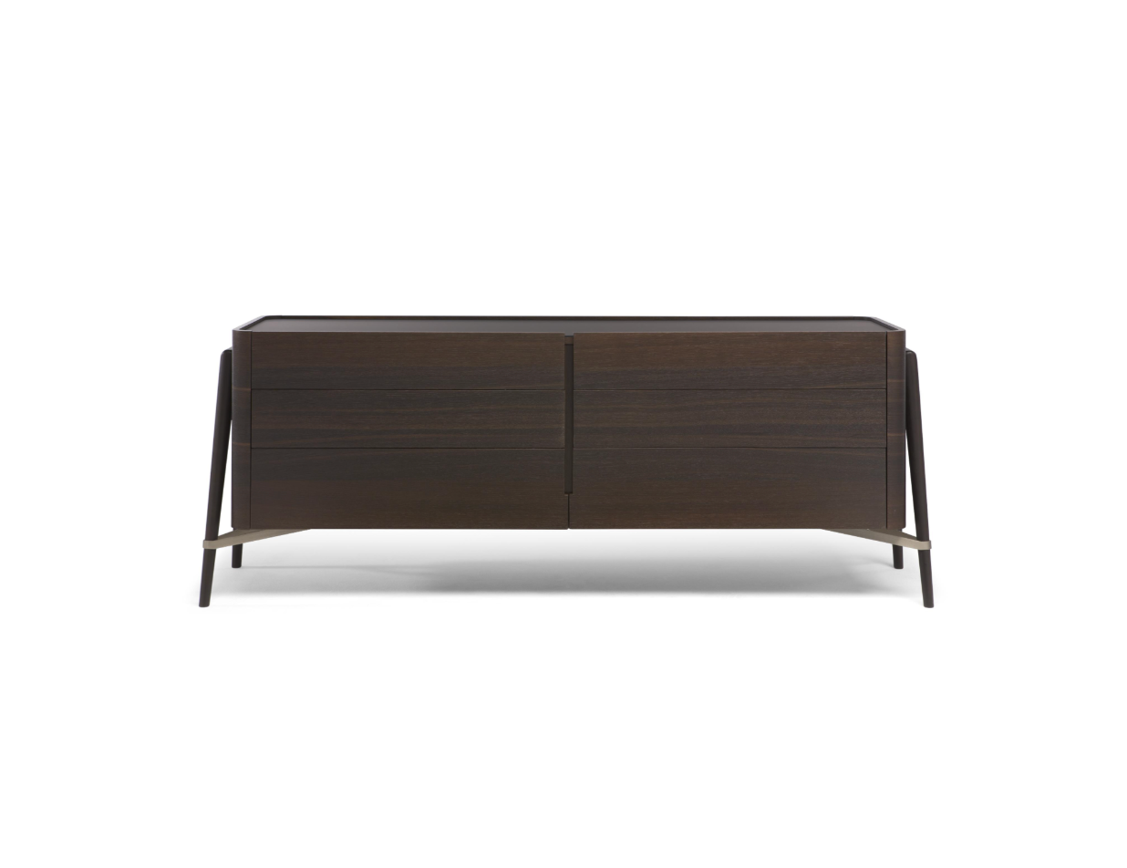 The typical 1950s proportions are reproduced in the Svevo chest of drawers. The frame rests elegantly on feet in solid wood with a metal detail, the leitmotif of the project. Svevo has a novel coordinated look that taps into a nostalgic aesthetic, it features solidwood legs that seem to rise up to embrace the frame and have been embellished with sublime metal detailing.