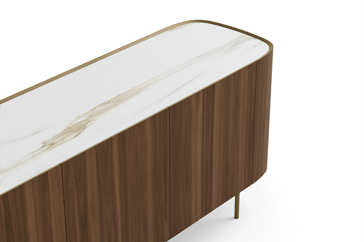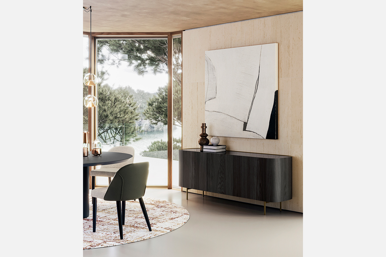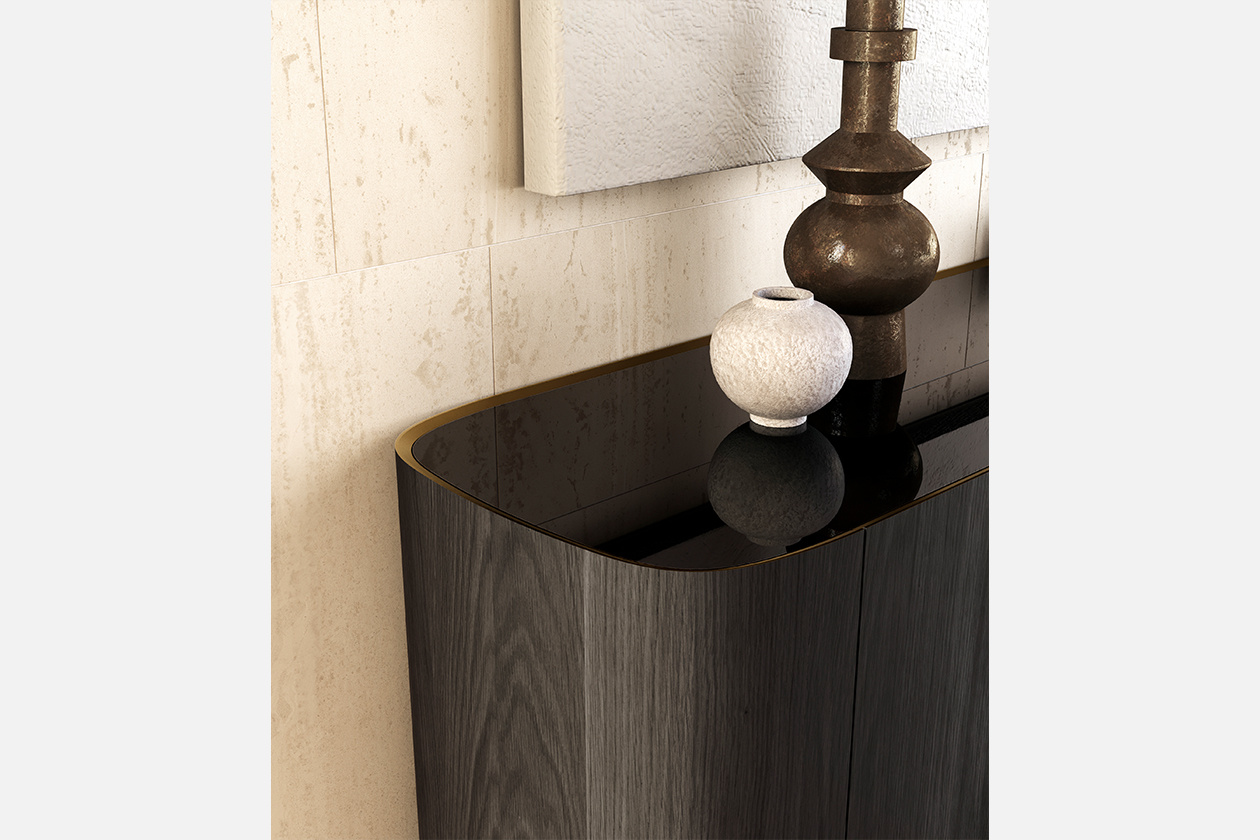 Syra is the elegant three-door sideboard created by designer Ollen Pal which, thanks to the important roundness, best expresses the highest quality workmanship. Handcrafted, the sideboard with three doors is made up of a veneered wood structure and a bronze lacquered upper edge, supported by four painted metal feet finished in bronze. The shelf can be in glass or ceramic, while the comfortable internal shelves are in smoked glass. The distinctive feature that gives refinement to this elegant sideboard is the refined contrasting detail of the internal profile of the top. This interesting piece of furniture can be positioned parallel to the dining table, as is traditionally used. Alternatively it can be used as a divider between the kitchen and living room in a living area, furnish a corridor at the entrance or become the protagonist if placed along a wall. To enhance the extreme sophisticated elegance that characterizes the Syra sideboard, we recommend combining it with the Decor floor lamp.