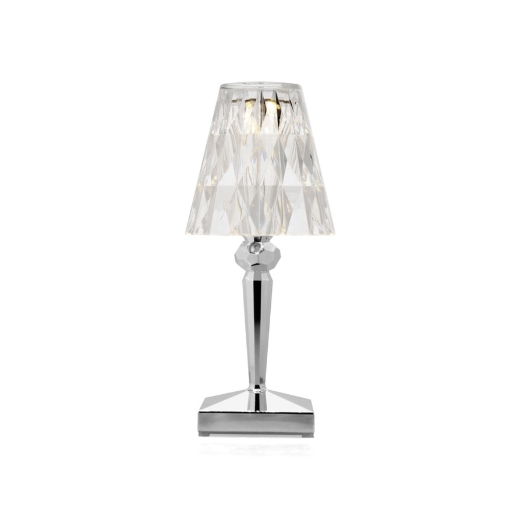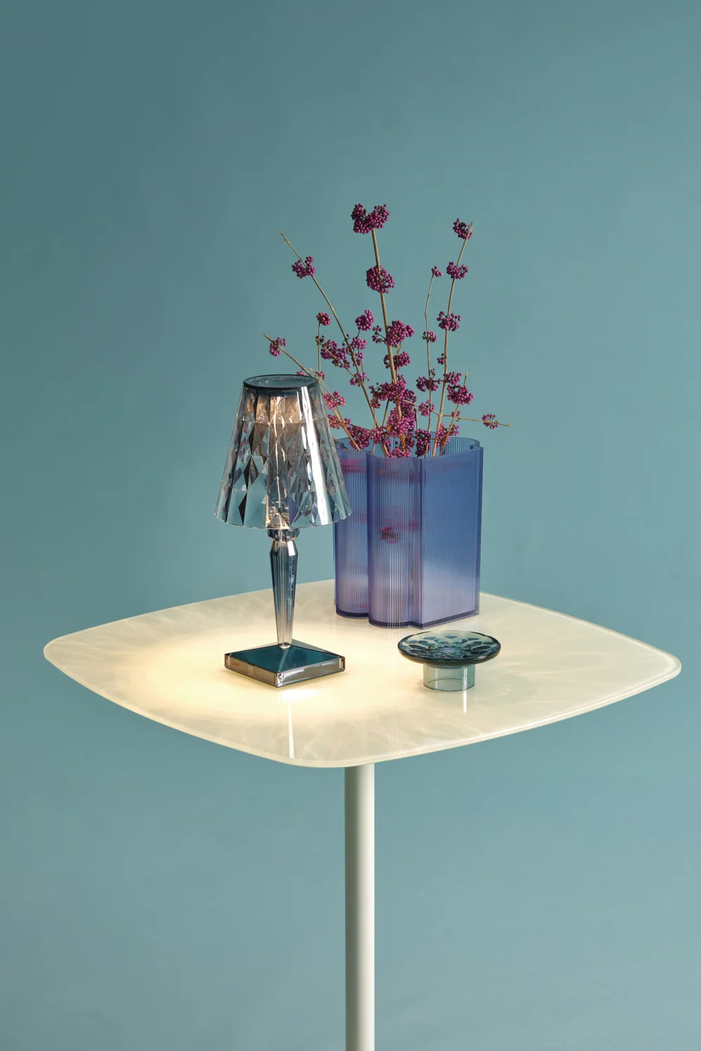 Battery is a compact table lamp innovatively characterised by the fact that it is 100% rechargeable thanks to a simple electric plug, with up to eight hours of battery life. This makes it easy to move, ideal for temporary contract set-ups, for use in cafés or in open air restaurants.
