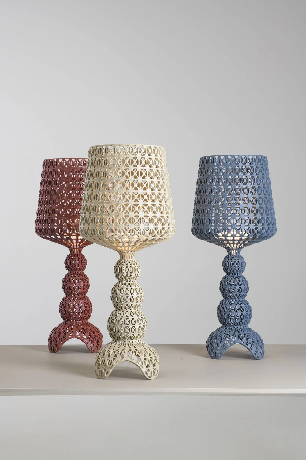 LED table lamp Kartell Mini Kabuki of transparent or through-dyed 2.0 polycarbonate of renewable materials. Diffuse illumination and upward light. With dimmer on the light head's underside.