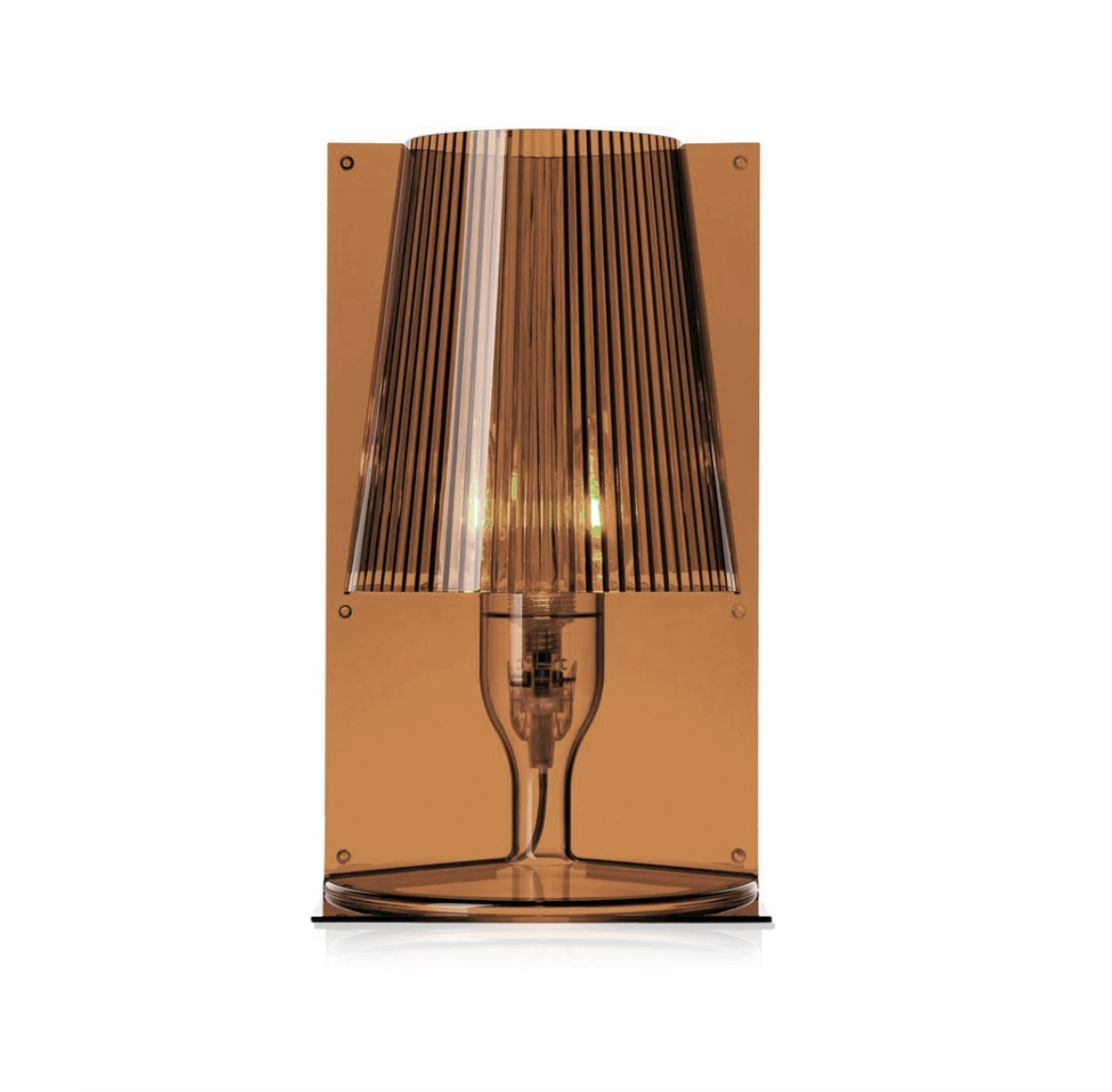 The classic icon of the bedside lamp is revisited by Kartell's technology to become an industrial product in a variety of colour shades. The shape of Take is the result of the joining of two specular parts: two flat, rectangular sheets which, from being two-dimensional at the centre, take on the shape and volume of a "semi-lamp". The internal pleating of the diffuser embellishes the object, creating, when lit, a play of reflections.