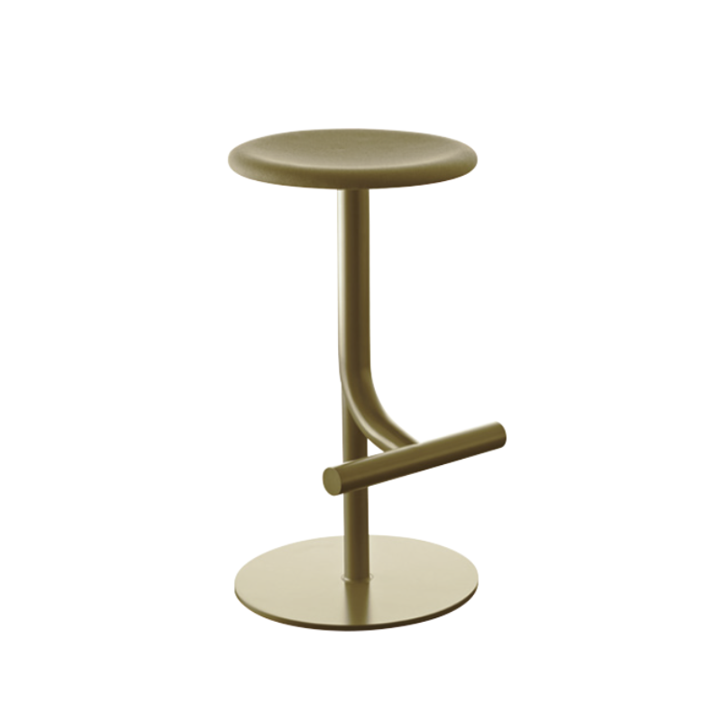 Swivel bar stool. Adjustable in height with gas piston. Materials: Frame in steel painted in polyester powder. Flame retardant. Seat in polyurethane or covered in fabric (Kvadrat “Steelcut 2“).