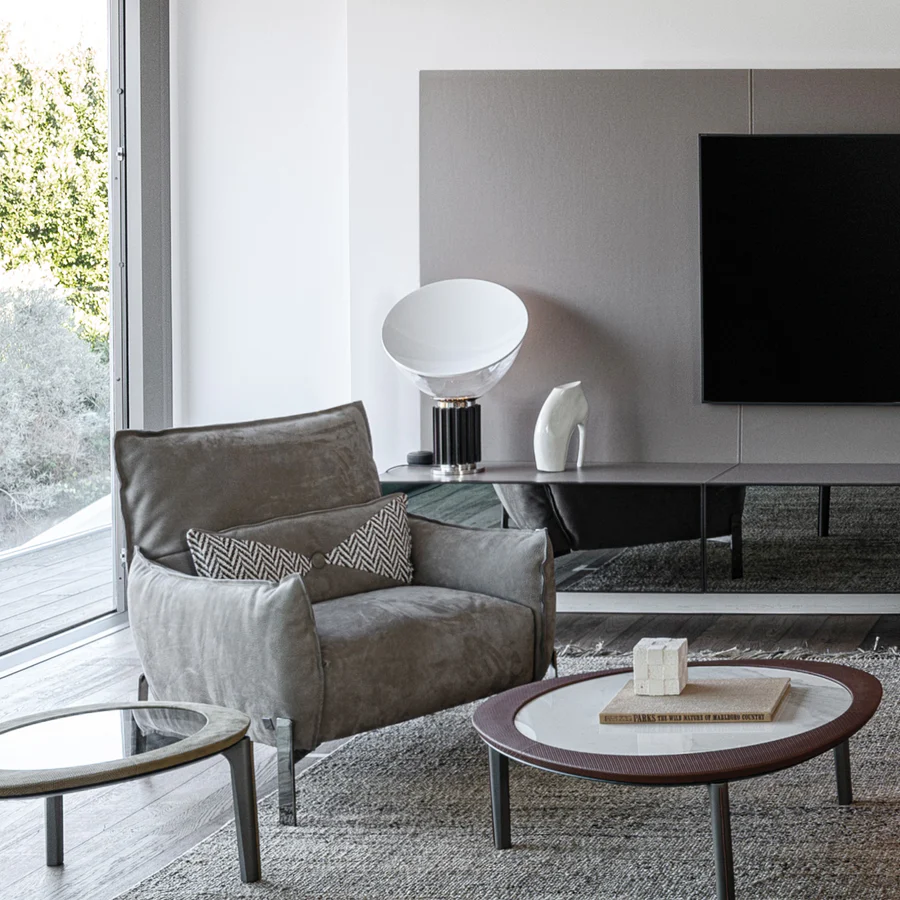 Curved, soft, comfortable armchair entirely in luxurious Italian leather, resting on solid black chrome metal legs. Seat cushion in expanded polyurethane foam with three different densities, covered with Siliconized Microfiber. Armrests with metal structure and wooden frame, padded with expanded polyurethane foam and coupled Siliconized Microfiber. Loose back cushion available for an additional charge.