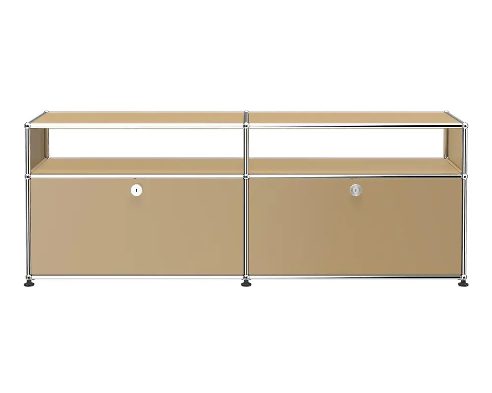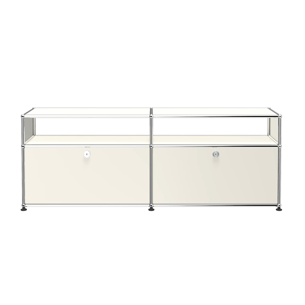 Media storage credenza with two drop down doors that lock with the twist of a coin. Cable cut out is included.