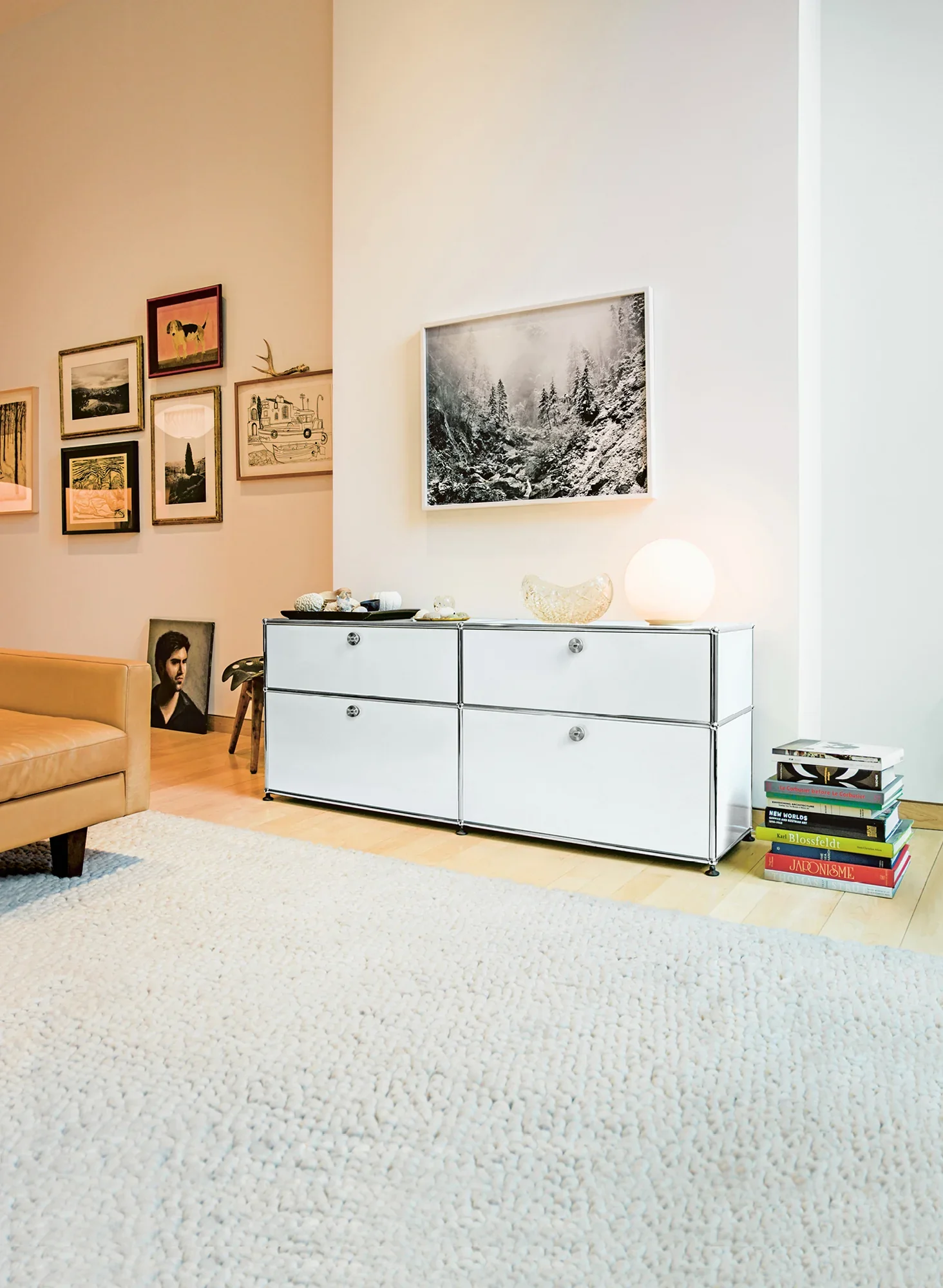 A modern storage cabinet or media credenza with four drop-down doors that lock with the twist of a coin.