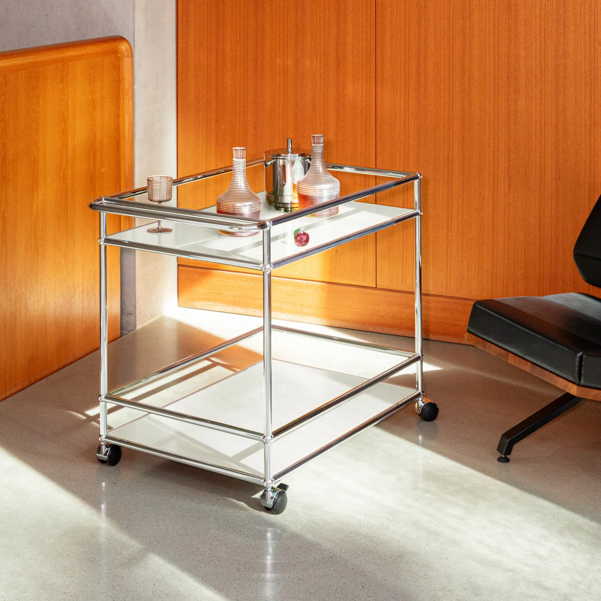 This modern serving cart offers plenty of space for all your entertaining needs. Designed with a handle and casters for easy mobility.