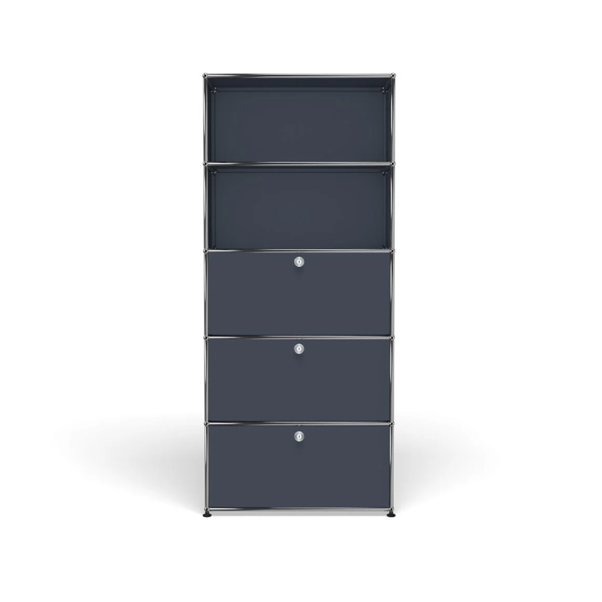 The multi-purpose storage unit with two drop down doors and one bottom drawer that locks with the twist of a coin. There is a cable cut out in the top compartment to set up a workspace.