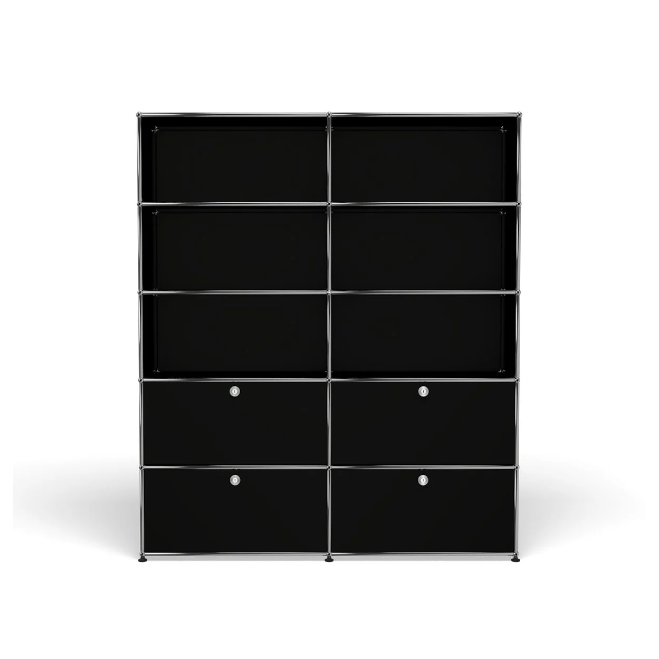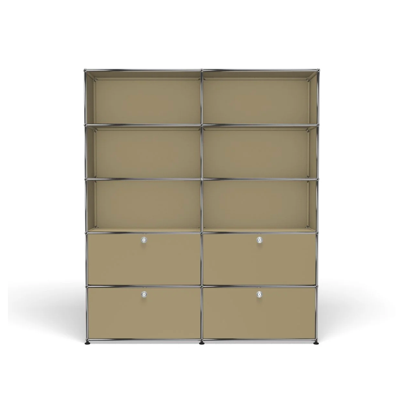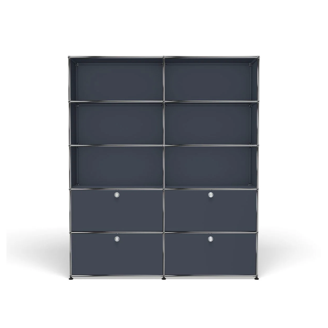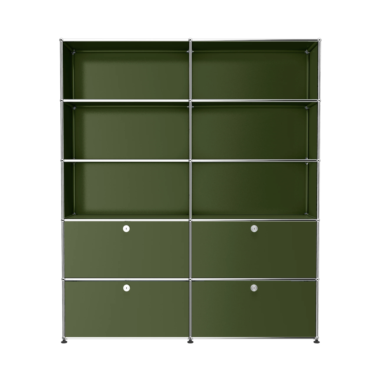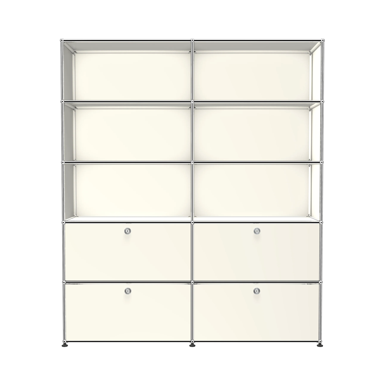 Storage and shelving combined with six open shelves, two 14"H drop down doors (top), two 14"H drawers (bottom). Available in 14 standard surface colors.