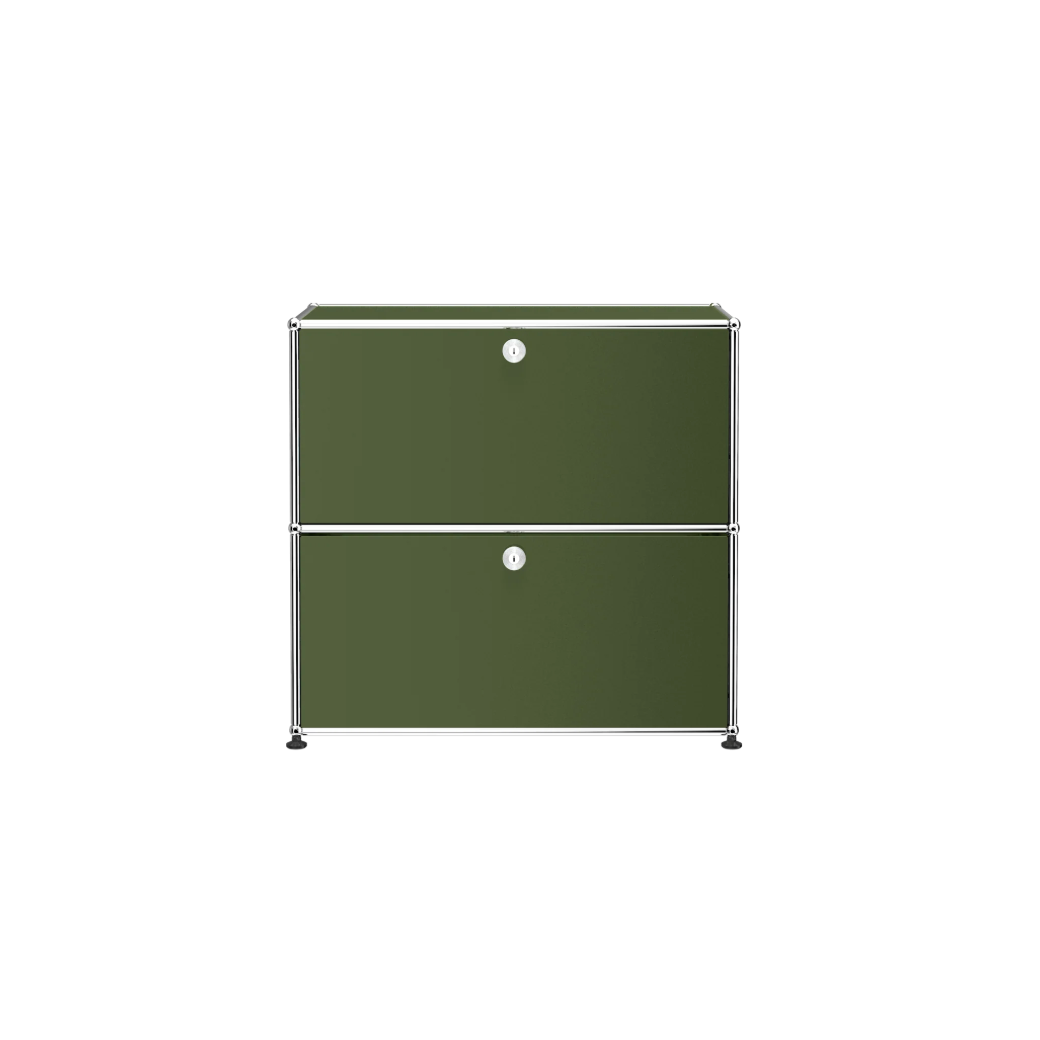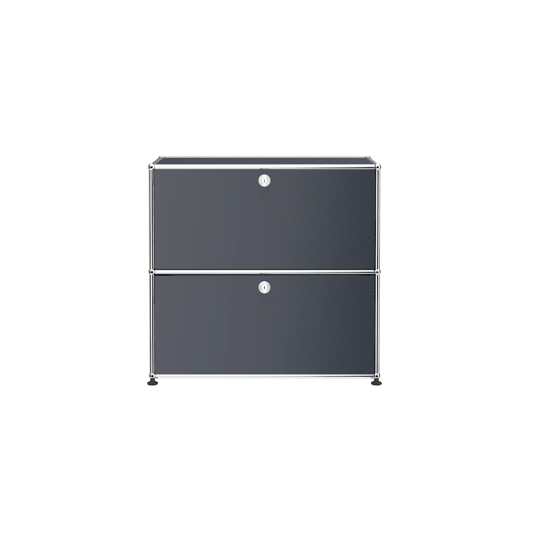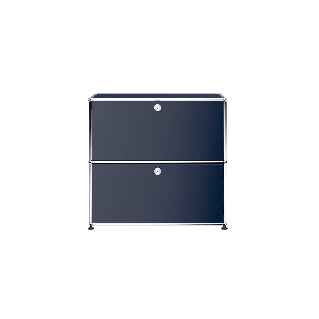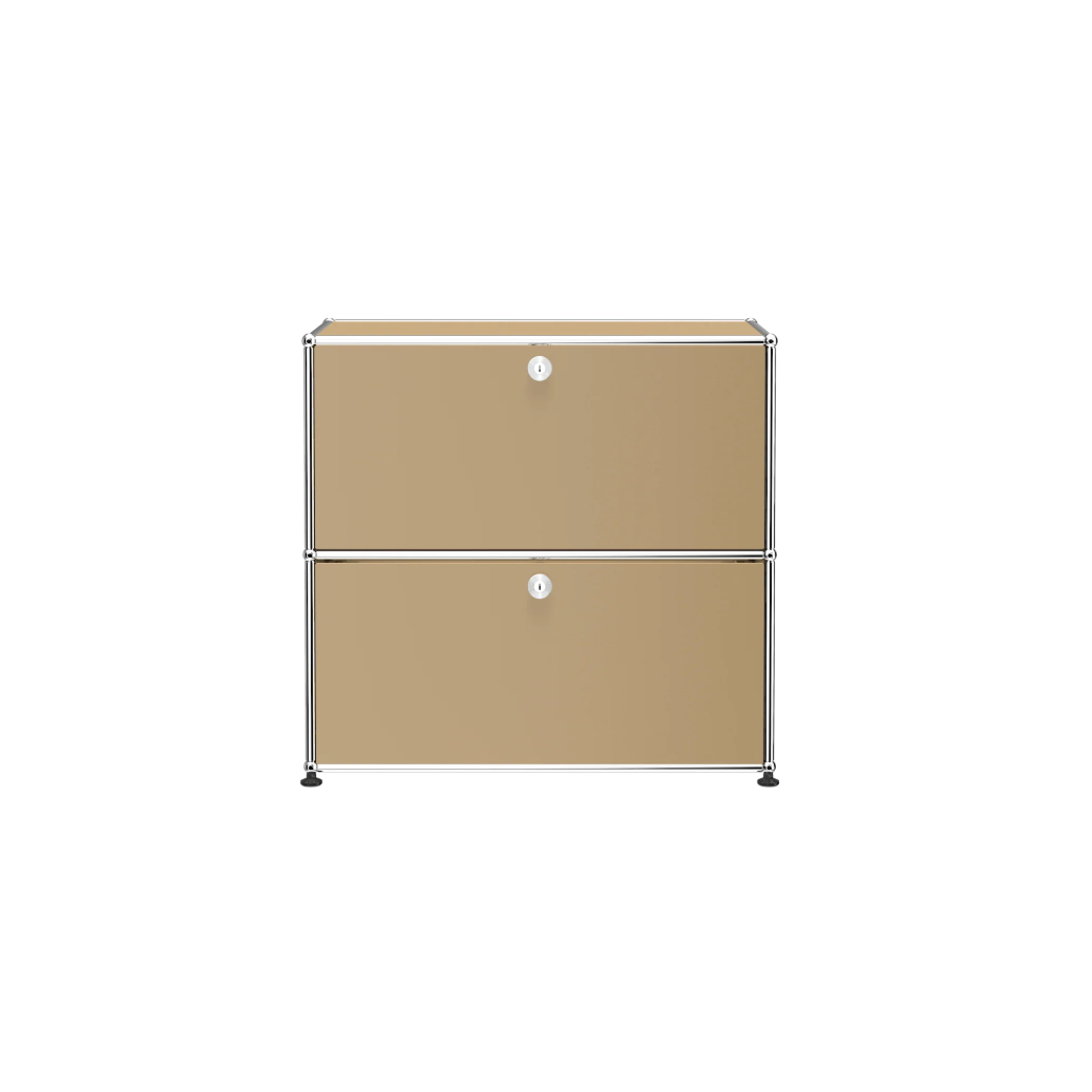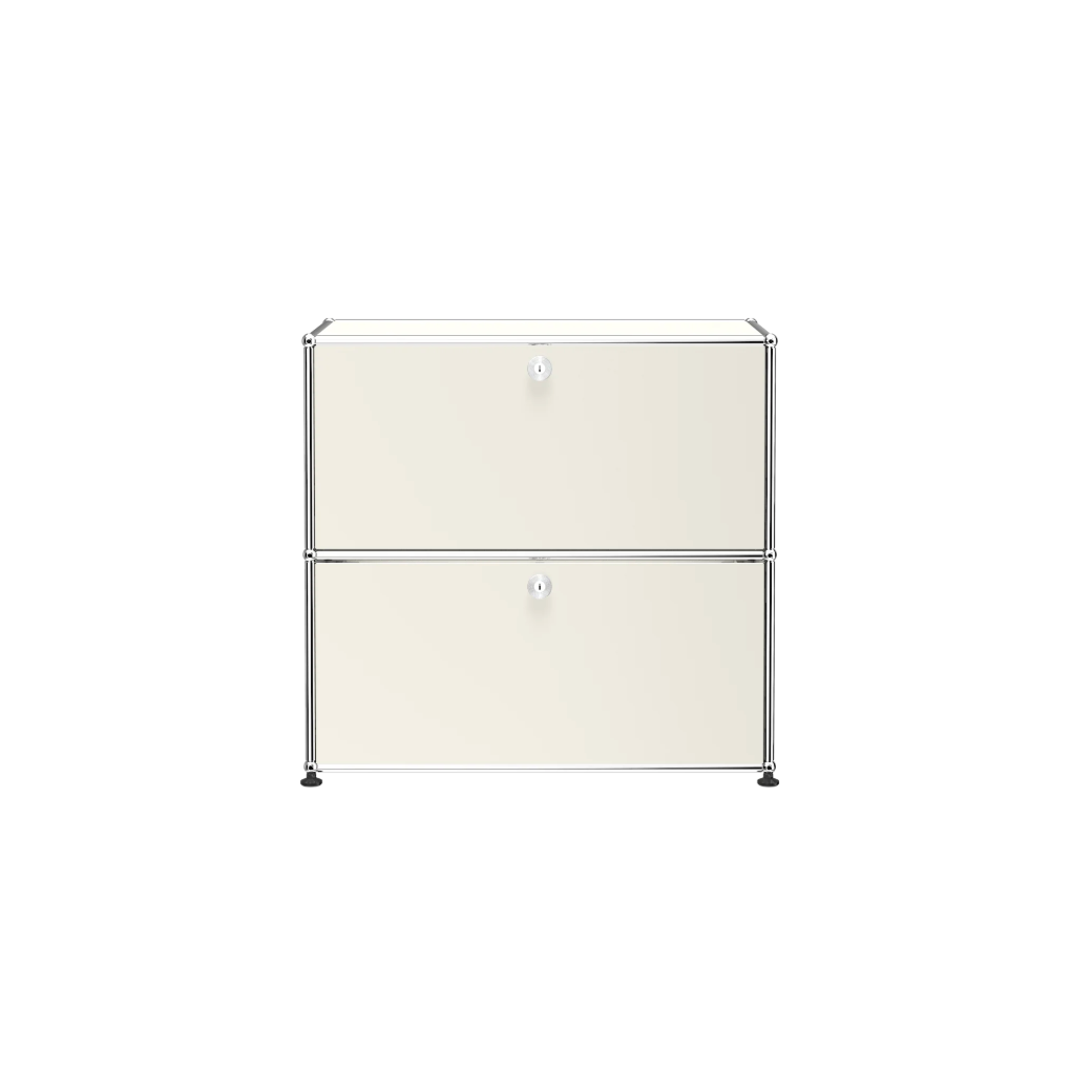 A stylish storage credenza with a 14"H top drop down door and a 14"H bottom drawer that lock with the twist of a coin.